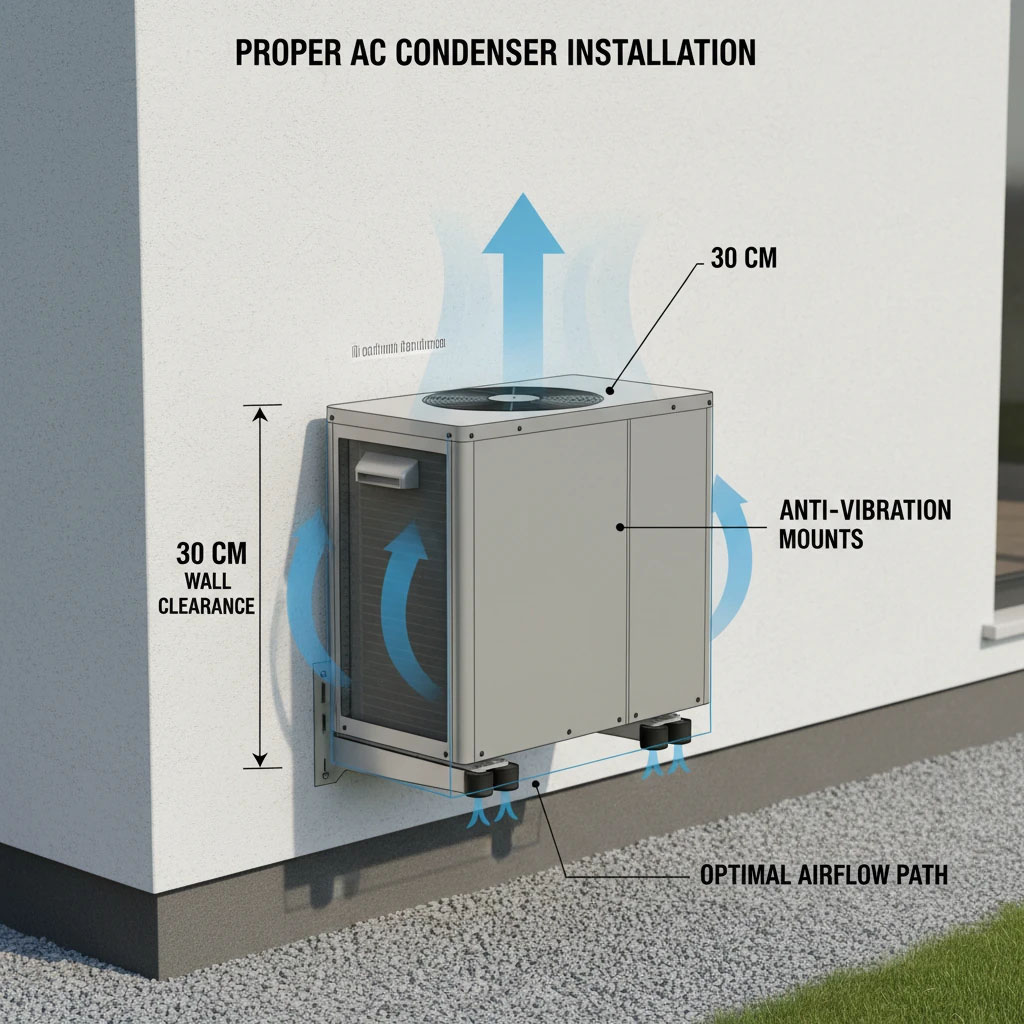 کندانسور باید توانایی گردش هوا داشته باشد؛ وگرنه: داغ می‌شود، اتومات می‌کند و قطعات آسیب می‌بینند. نصاب‌های عجول معمولاً کندانسور را در فضای تنگ می‌گذارند، اما این کار راندمان دستگاه را تا ۲۵٪ کاهش می‌دهد.