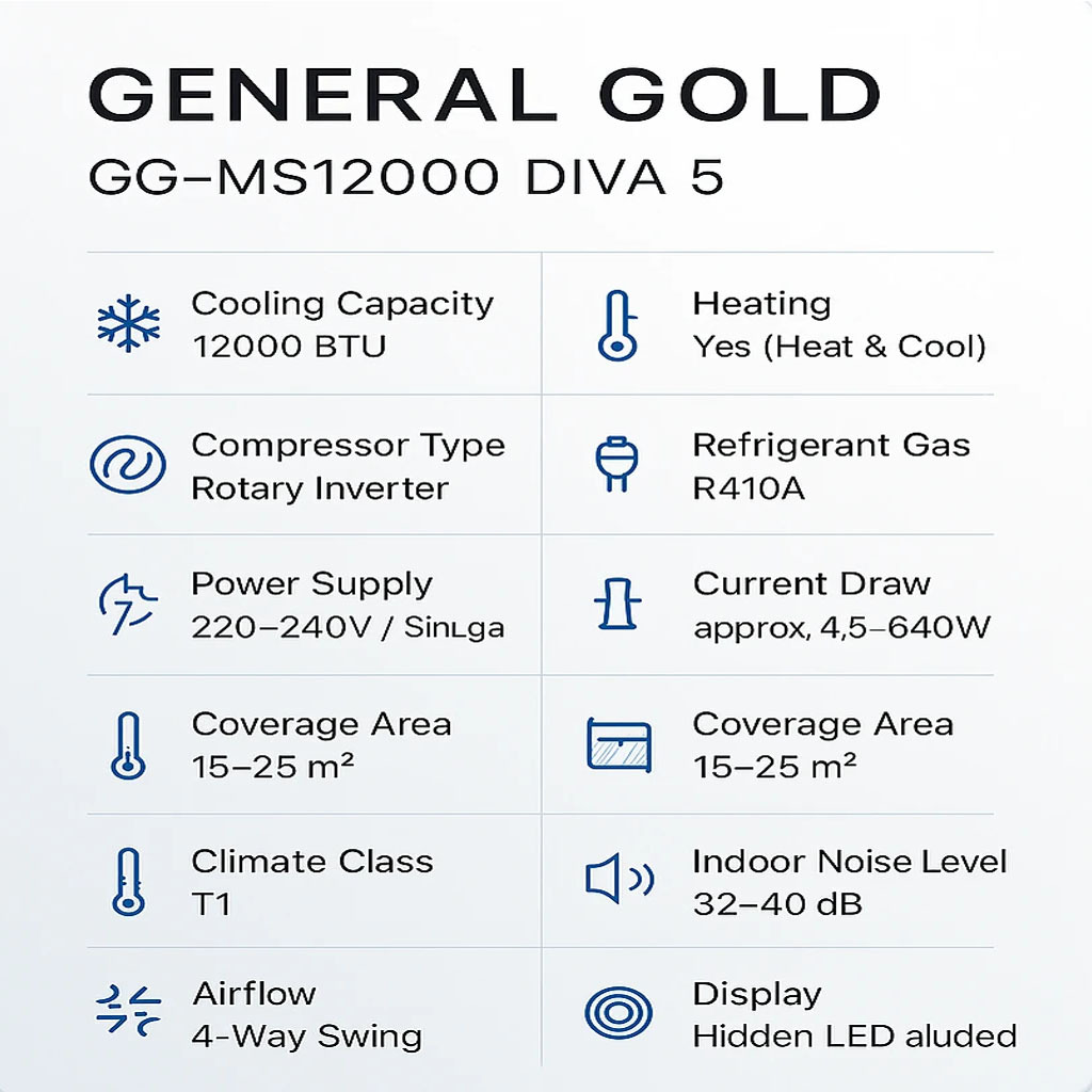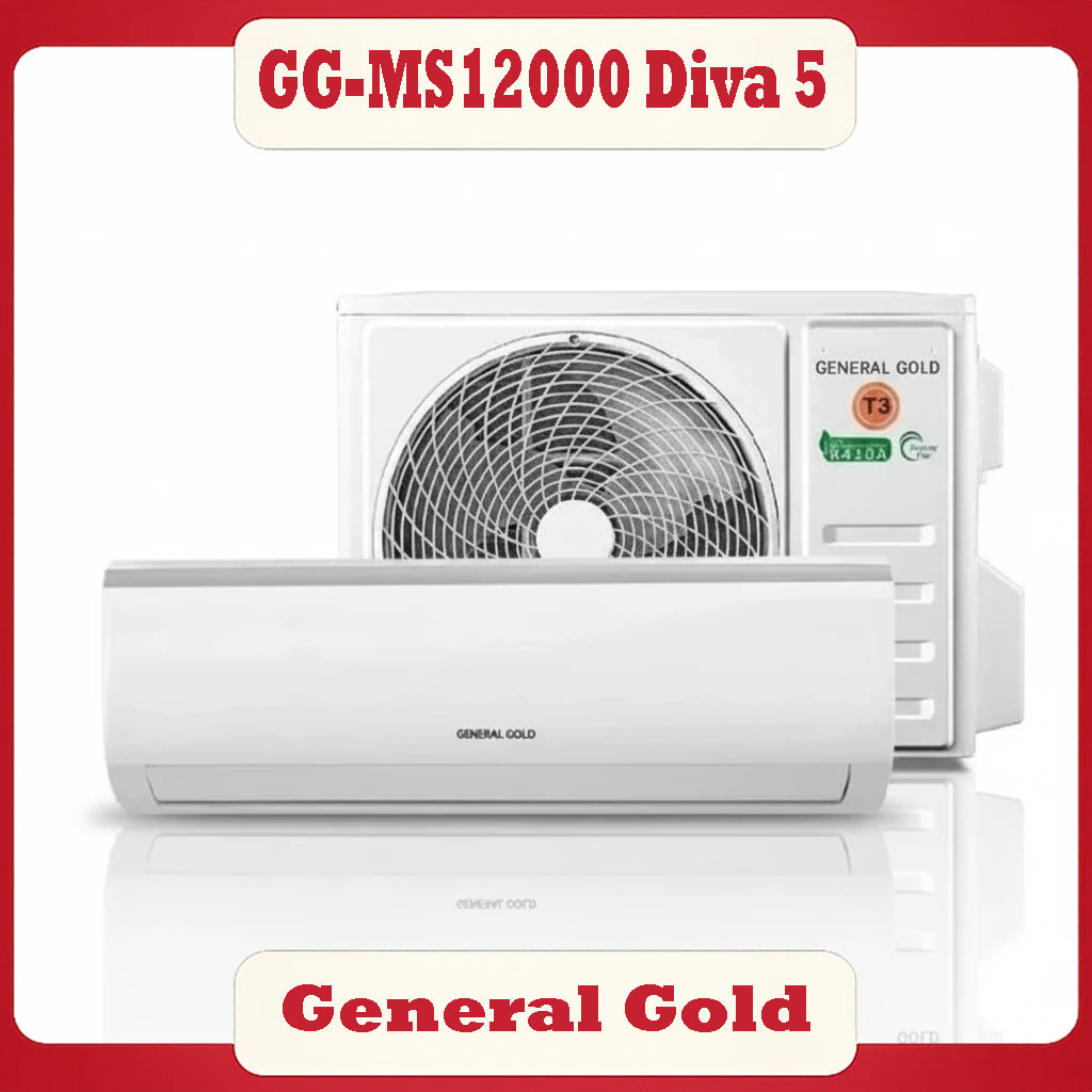 کولر گازی اسپلیت General Gold GG‑MS12000 DIVA 5 یکی از محبوبترین مدلهای کممصرف 12000 در بازار است که با ترکیب طراحی مدرن، کمپرسور Rotary Inverter و گاز مبرد R410A عملکرد خنککنندگی بسیار مطلوبی ارائه میدهد. این مدل برای فضاهای 15 تا 25 متر مربع ایدهآل بوده و در اتاقخواب، سالنهای کوچک، دفاتر کاری و محیطهای گرمسیری عملکردی پایدار و قدرتمند دارد.