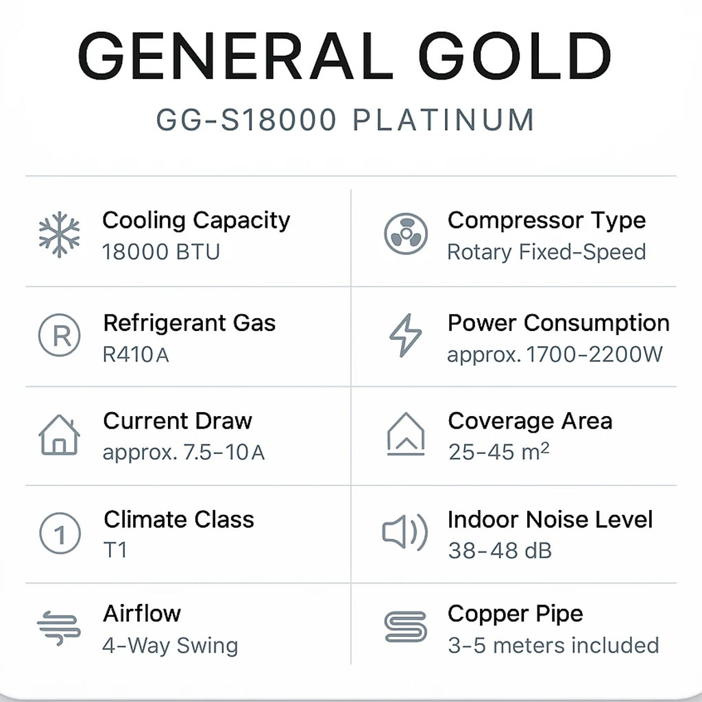 کولر گازی General Gold GG‑S18000 Platinum یکی از پرفروشترین مدلهای 18000 بازار در دسته اسپلیتهای دور ثابت (Non‑Inverter) است. این مدل با کمپرسور روتاری قدرتمند، عملکرد بسیار پایدار در هوای گرم و قابلیت سرمایش سریع، گزینهای مناسب برای سالنها و اتاقهای 25 تا 45 متر مربع محسوب میشود.